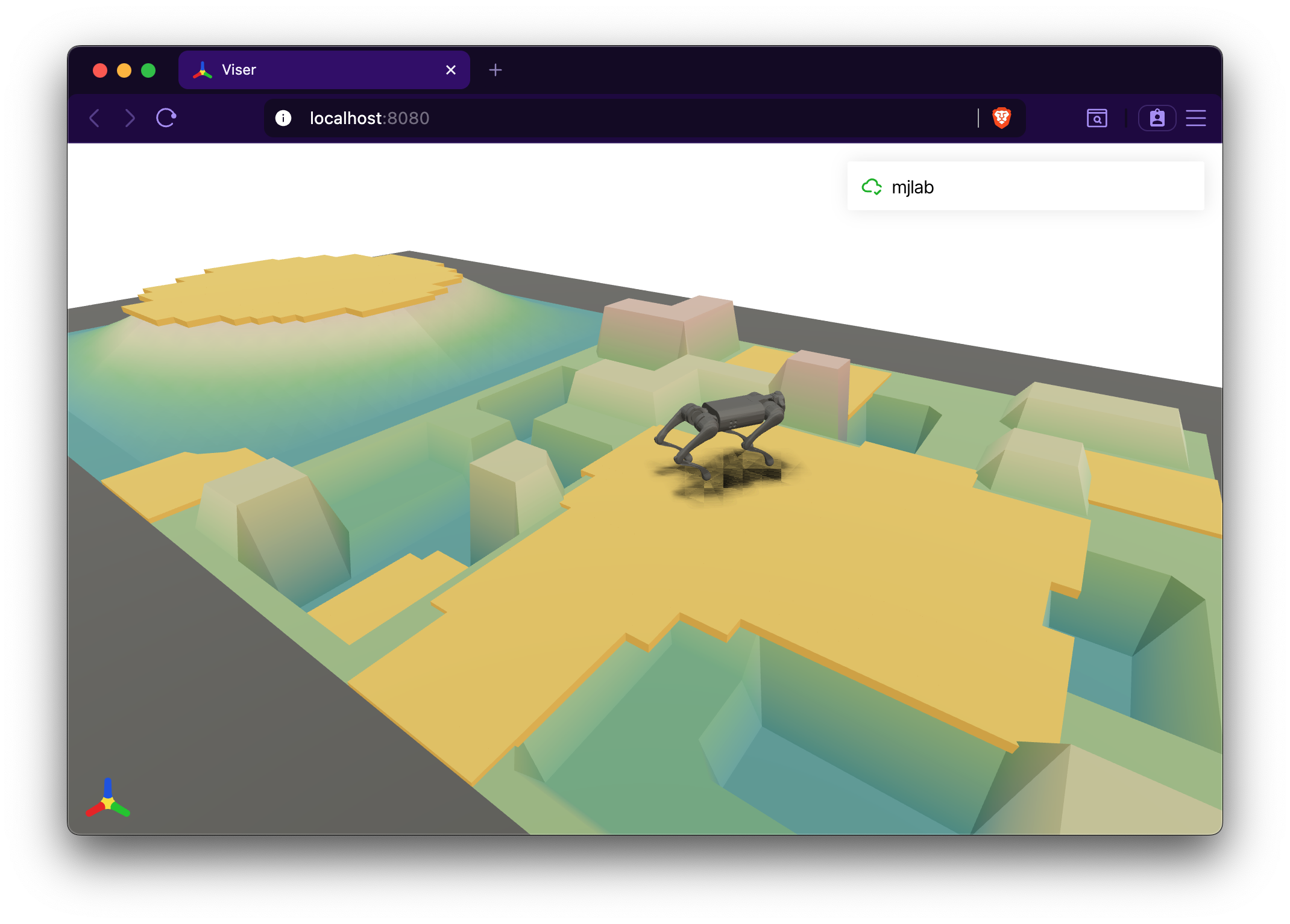 The terrain is the shared ground surface for all environments in a scene. mjlab supports two modes: a flat ground plane for tasks that do not need varying terrain, and a procedural terrain generator that assembles a grid of sub-terrain patches with configurable difficulty. Procedural terrain is particularly useful for training locomotion policies, where a curriculum of increasing ground difficulty drives robust walking and climbing behaviors.